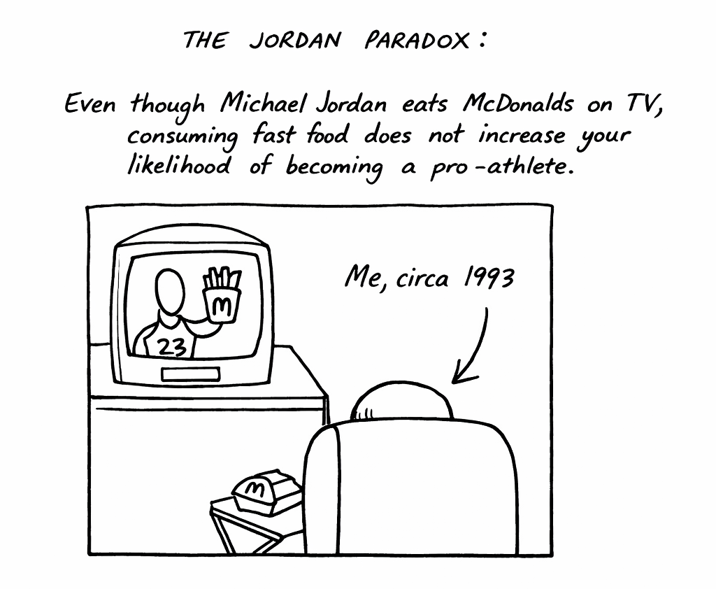 Back in the day, everyone wanted to BE LIKE MIKE. But consuming the products he promoted on TV didn’t turn us all into professional athletes. Not surprising. I sketched the “Jordan Paradox” to illustrate a point about environmental technologies.