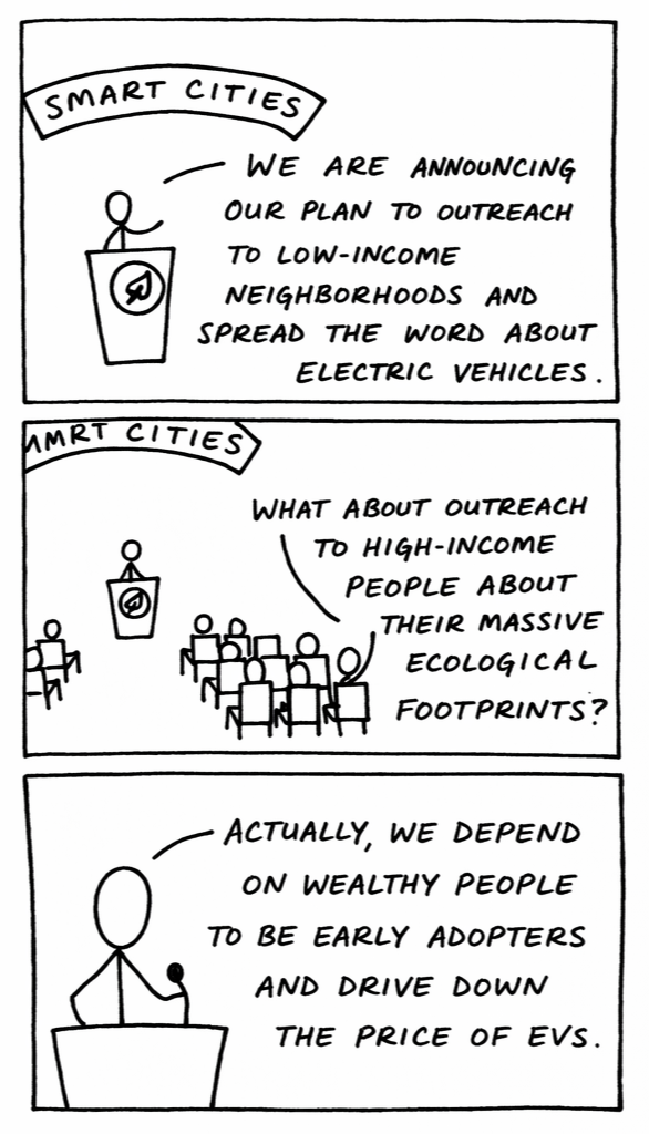 When this question about outreach to wealthy people came from the audience, it was treated as awkward and out of place. But I think it touched on the exact socio-ecological blindspot that is actively undoing all the potential benefits of decarbonization technology.