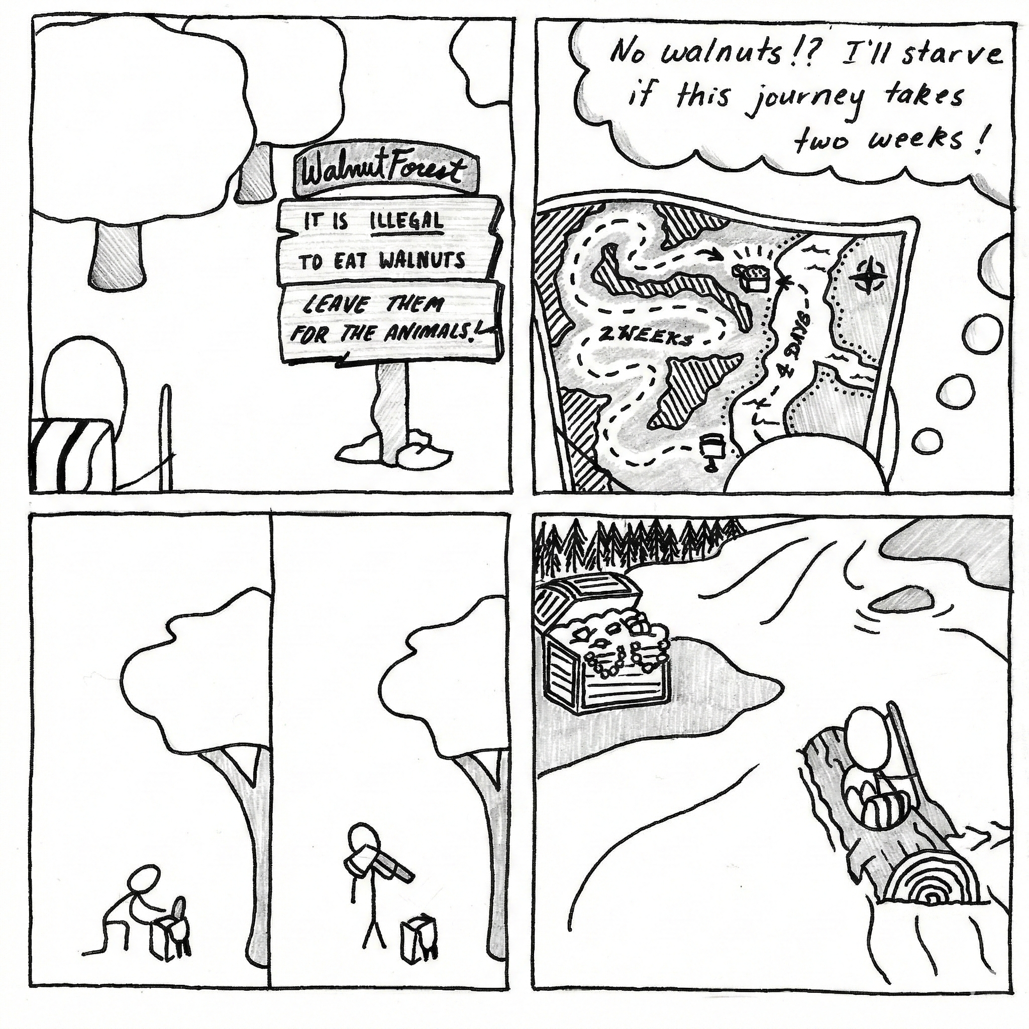 A treasure hunter planned to survive the long trek through Walnut Forest by harvesting and eating nuts. At the entrance to the forest is a warning: Walnut-eating is illegal! Too many hikers have been eating up this precious food source for the local wildlife.